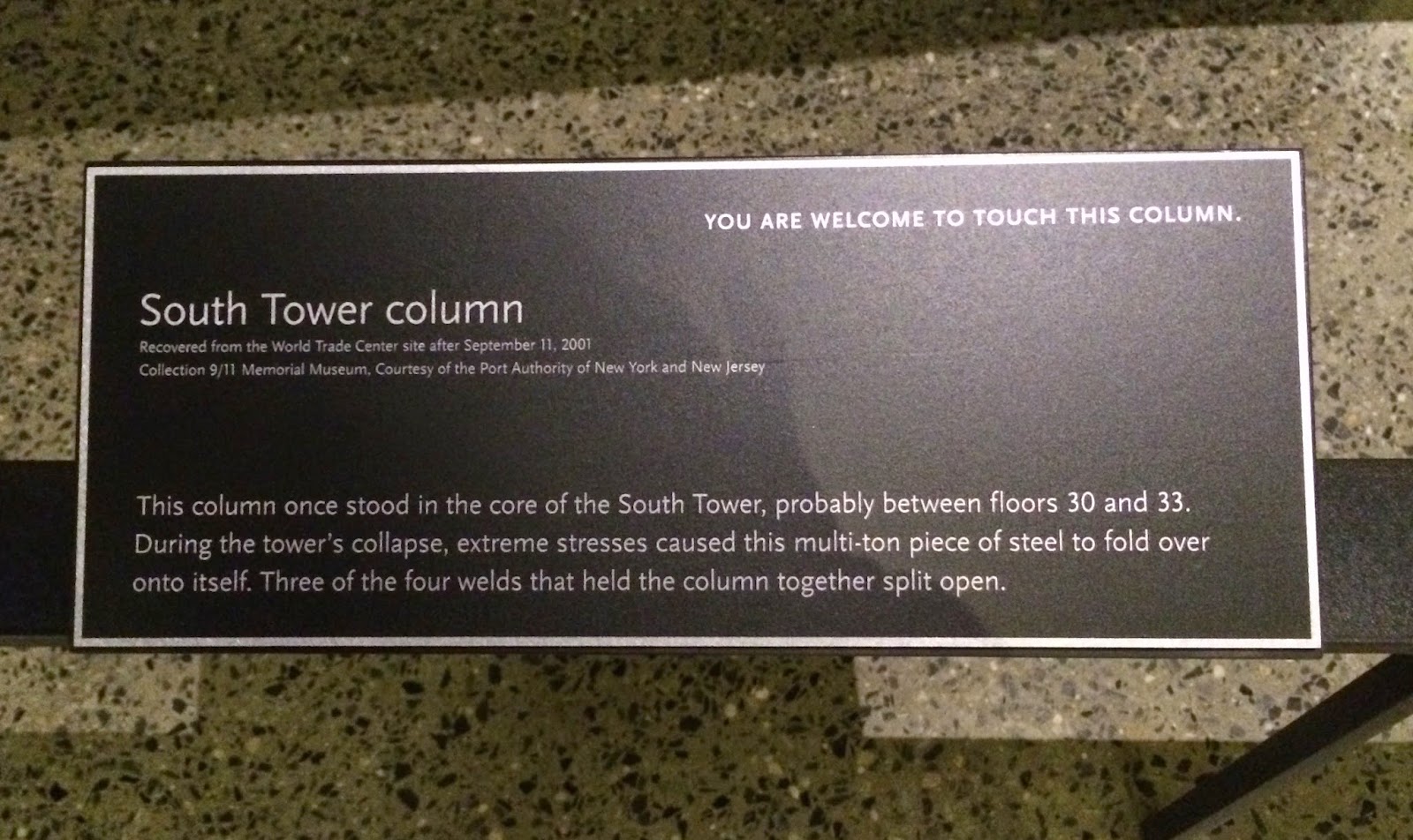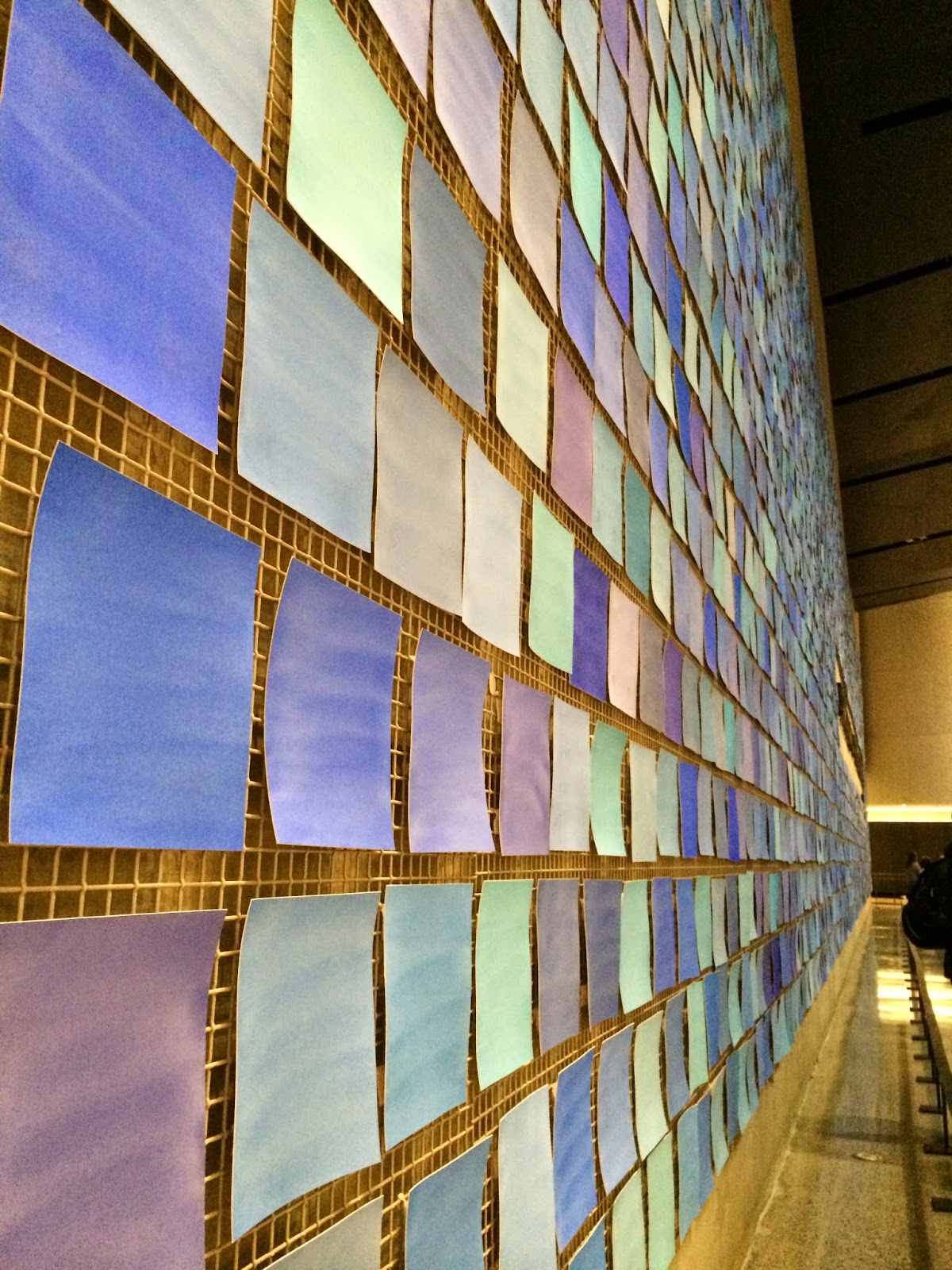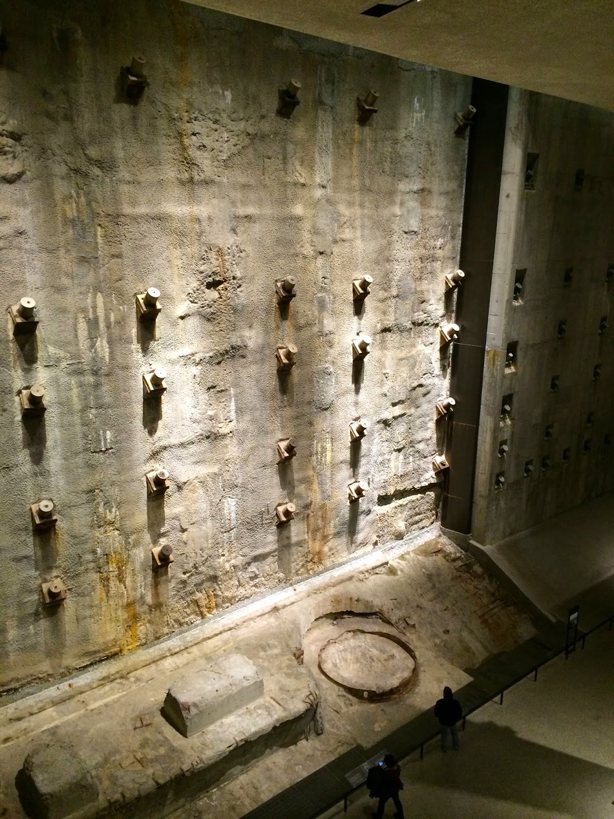 The original foundation wall (slurry wall) that holds back the Hudson and is the bedrock into which the towers were built, managed to stand. Had it collapsed, the flooding that ensued would have been even more catastrophic. Because the wall stood firm, architect Libeskind felt that it should be part of the museum and so it is, rising ghostly and majestically from the depths, as though you are about to climb up and out. Next to it drips tiny amounts of water from the Hudson just to prove its worth.